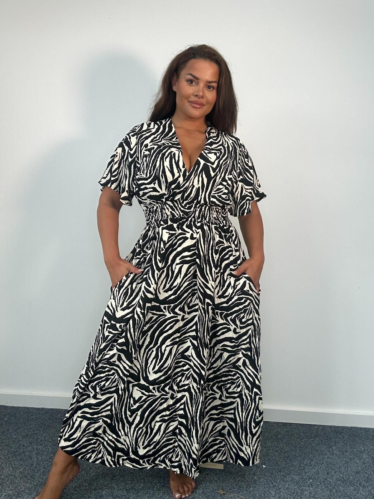 This on trend leopard print maxi dress, has a flattering cross over at the bust and pulls in at waist to give an elegant silhouette, its drapes over lumps and bumps. It also has pockets!!