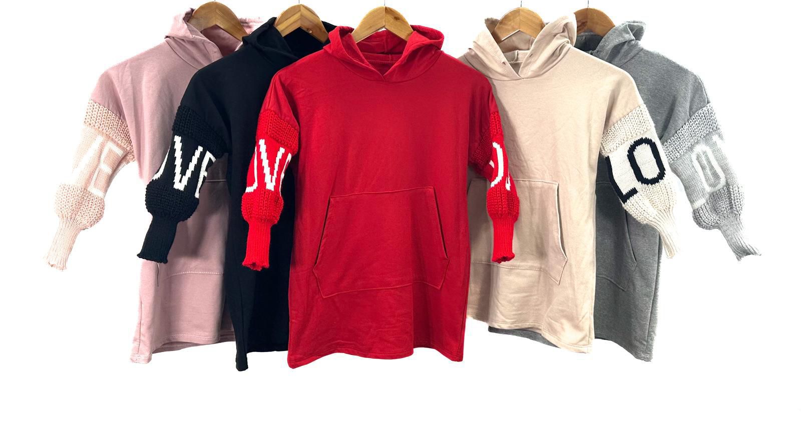 On trend hooded tunic dress, with knitted sleeve detail.